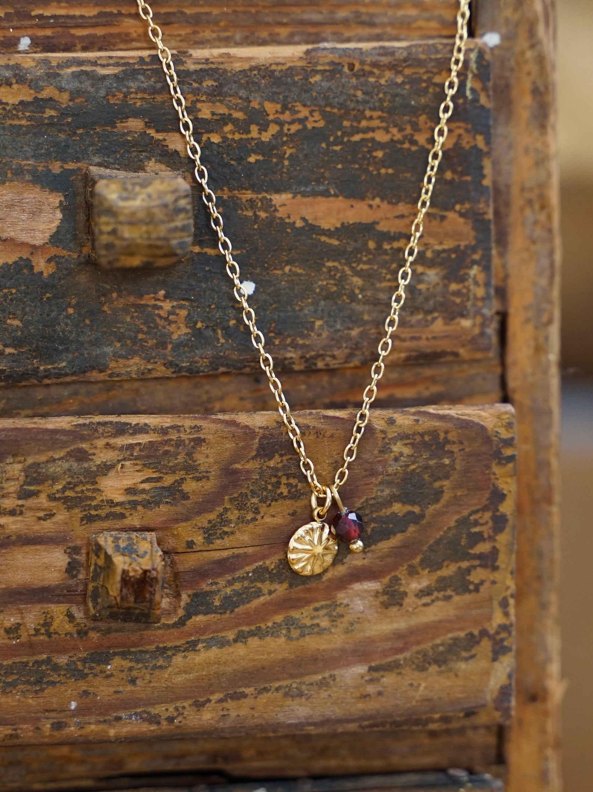 Eine elegante, filigrane Kette aus goldfarbenem Edelstahl mit einem schlichten Anhänger. Der Anhänger besteht aus einer Edelstahl-Scheibe mit einem eingravierten Stern und einer feinen Granat-Perle, die durch ihren sanften Schimmer eine edle und mystische Ausstrahlung erhält. Perfekt für den Alltag oder besondere Anlässe.