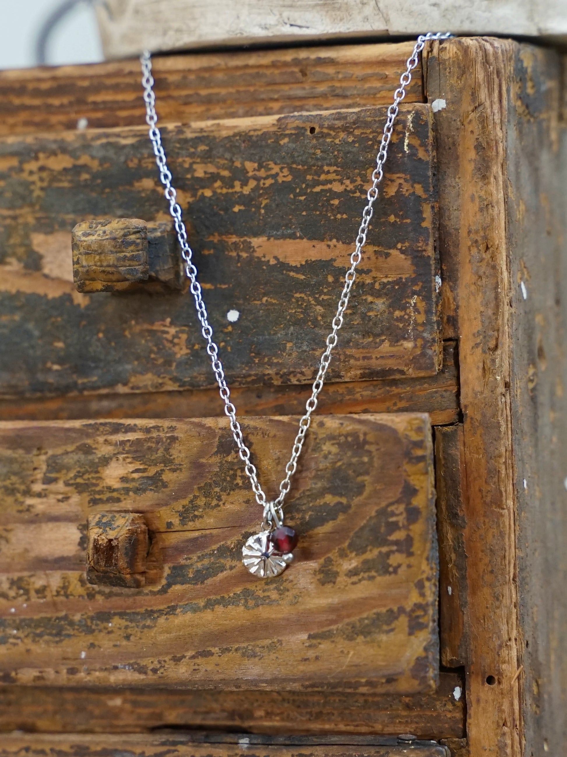 Eine elegante, filigrane Kette aus silberfarbenem Edelstahl mit einem schlichten Anhänger. Der Anhänger besteht aus einer Edelstahl-Scheibe mit einem eingravierten Stern und einer feinen Granat-Perle, die durch ihre frische Farbe und dezente Eleganz besticht. Perfekt für den Alltag oder besondere Anlässe.