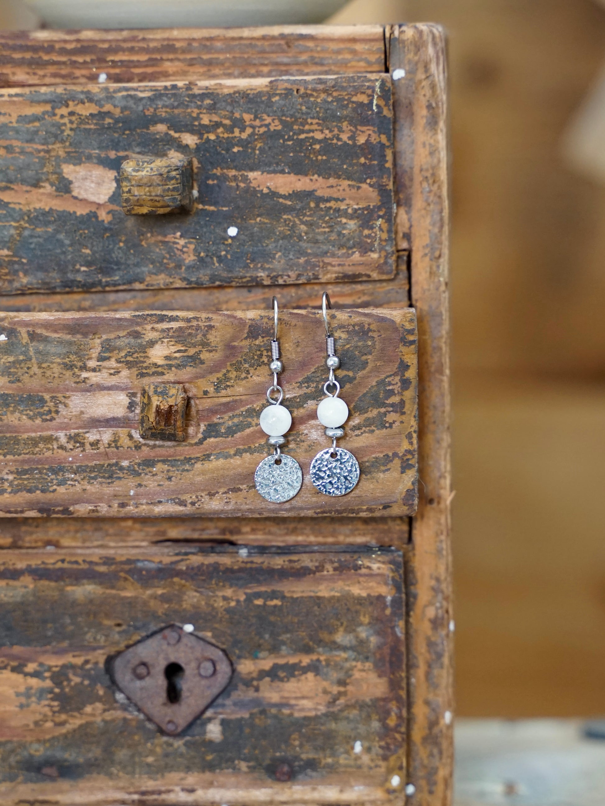 Minimalist earrings with a silver stainless steel hook, a white stone and a hammered, round stainless steel pendant. The simple elegance makes these earrings a timeless accessory for every occasion.