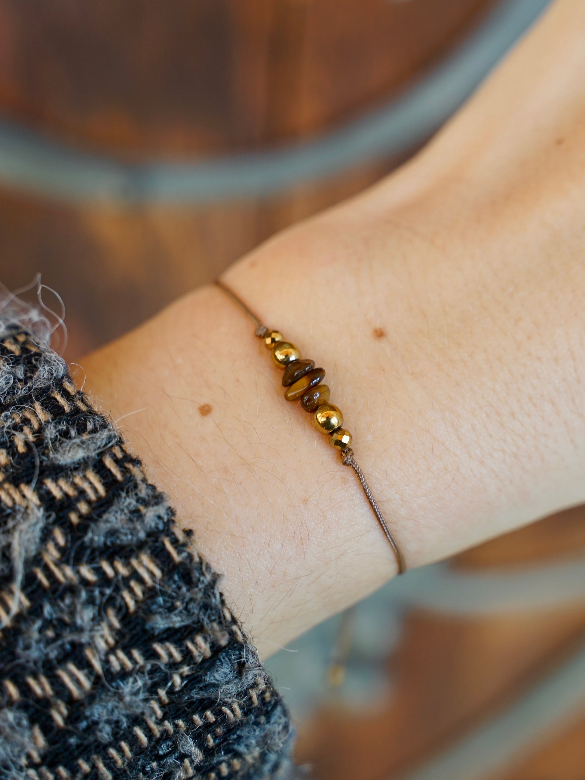 An elegant, adjustable bracelet made of brown Linhasita yarn, decorated with shimmering tiger eye chips and golden hematite stones. Perfect for adding a natural and stylish touch to your look.