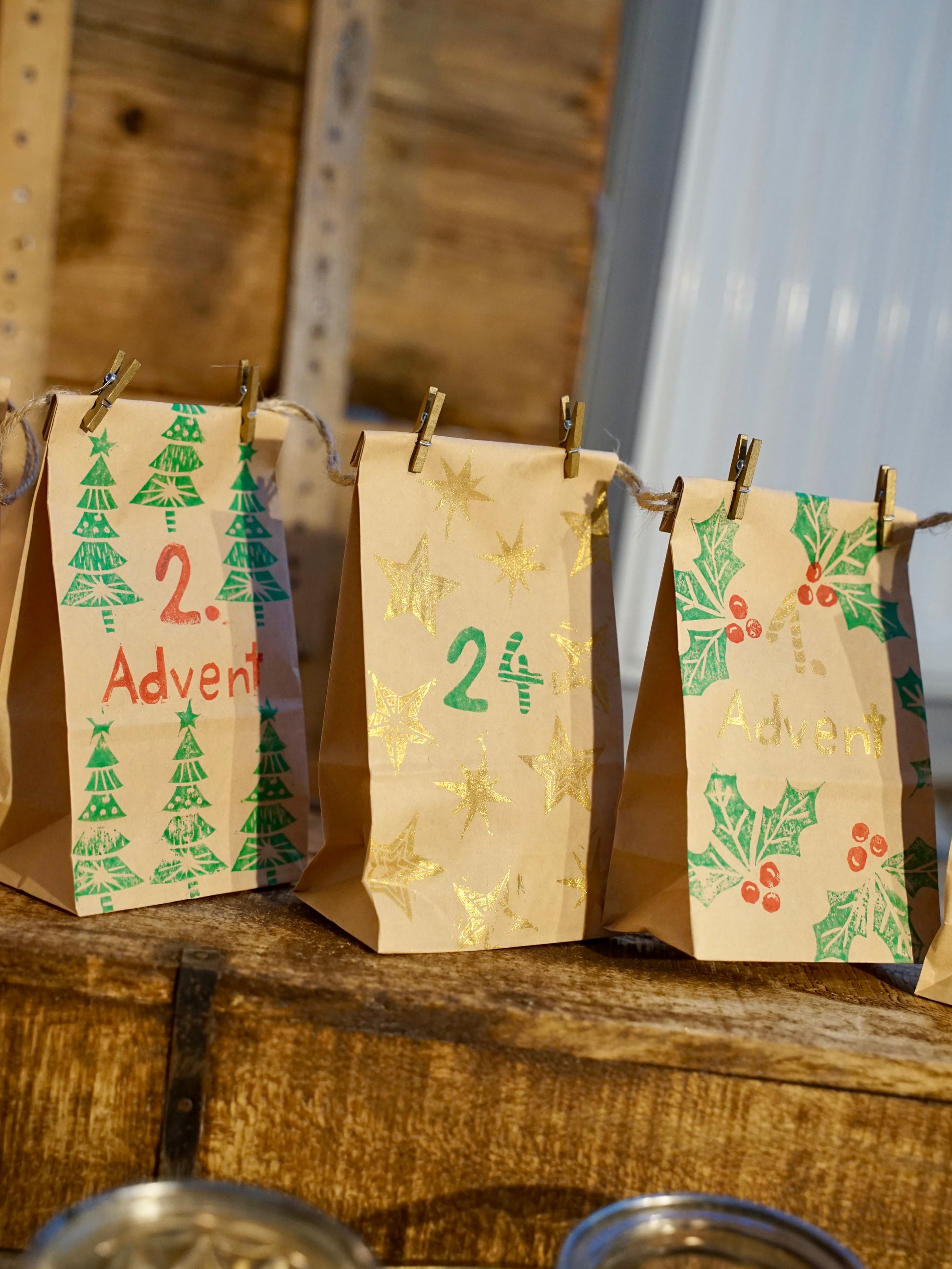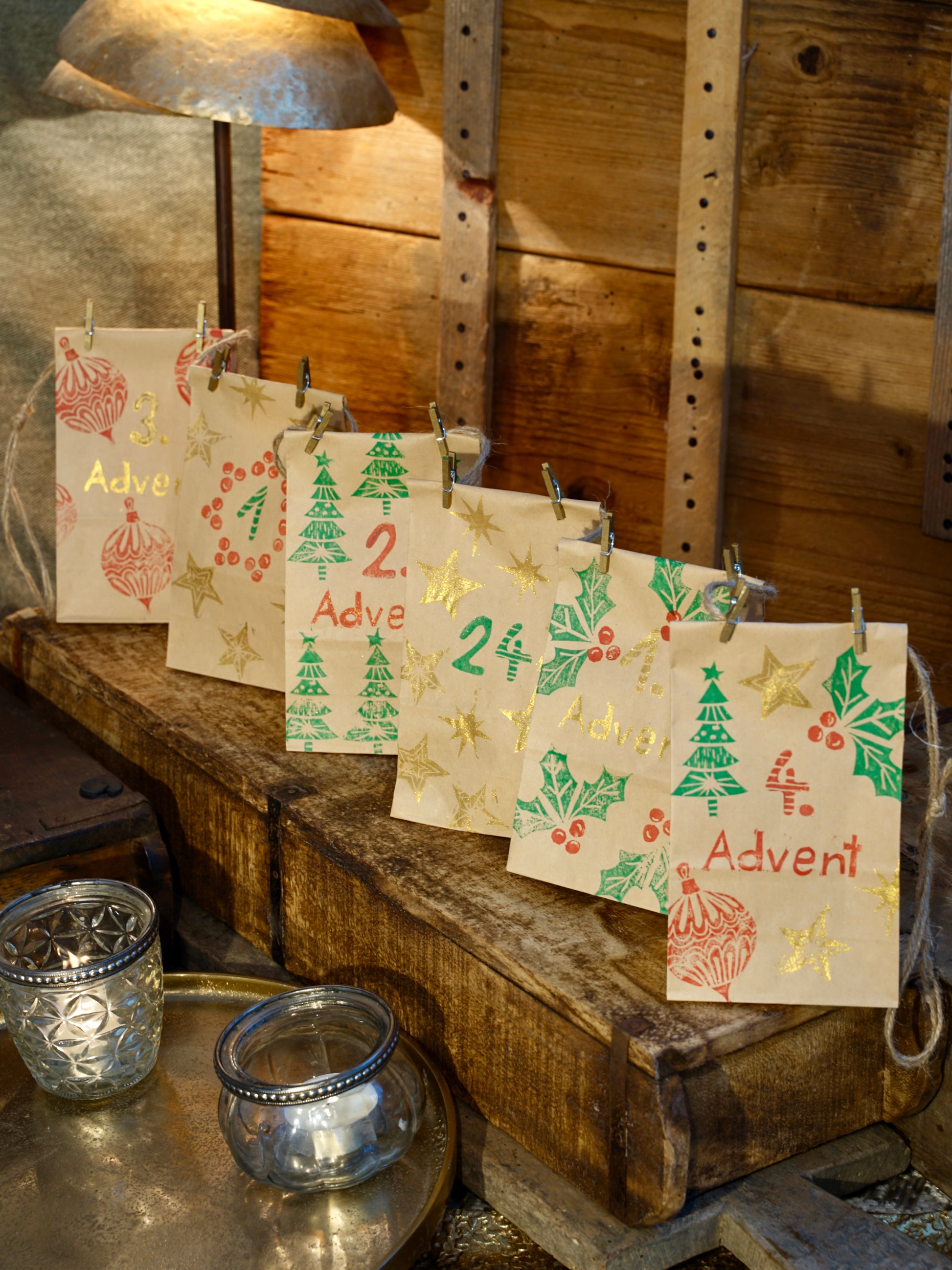 Ich mache den Kalender übrigens auch selber! Die Stempel habe ich händisch aus Linoleum ausgeschnitzt und dann gestempelt. Somit hast du einen liebevoll gestalteten Adventskalender für die Adventszeit bei dir zuhause hängen.