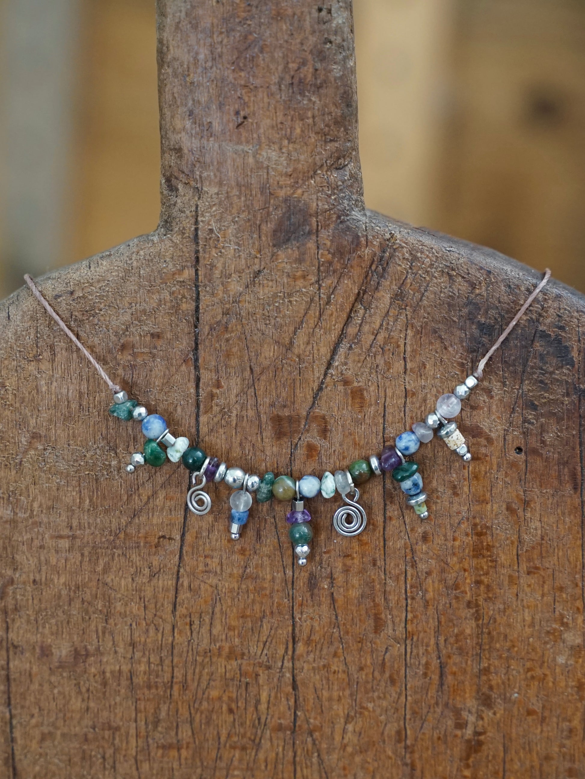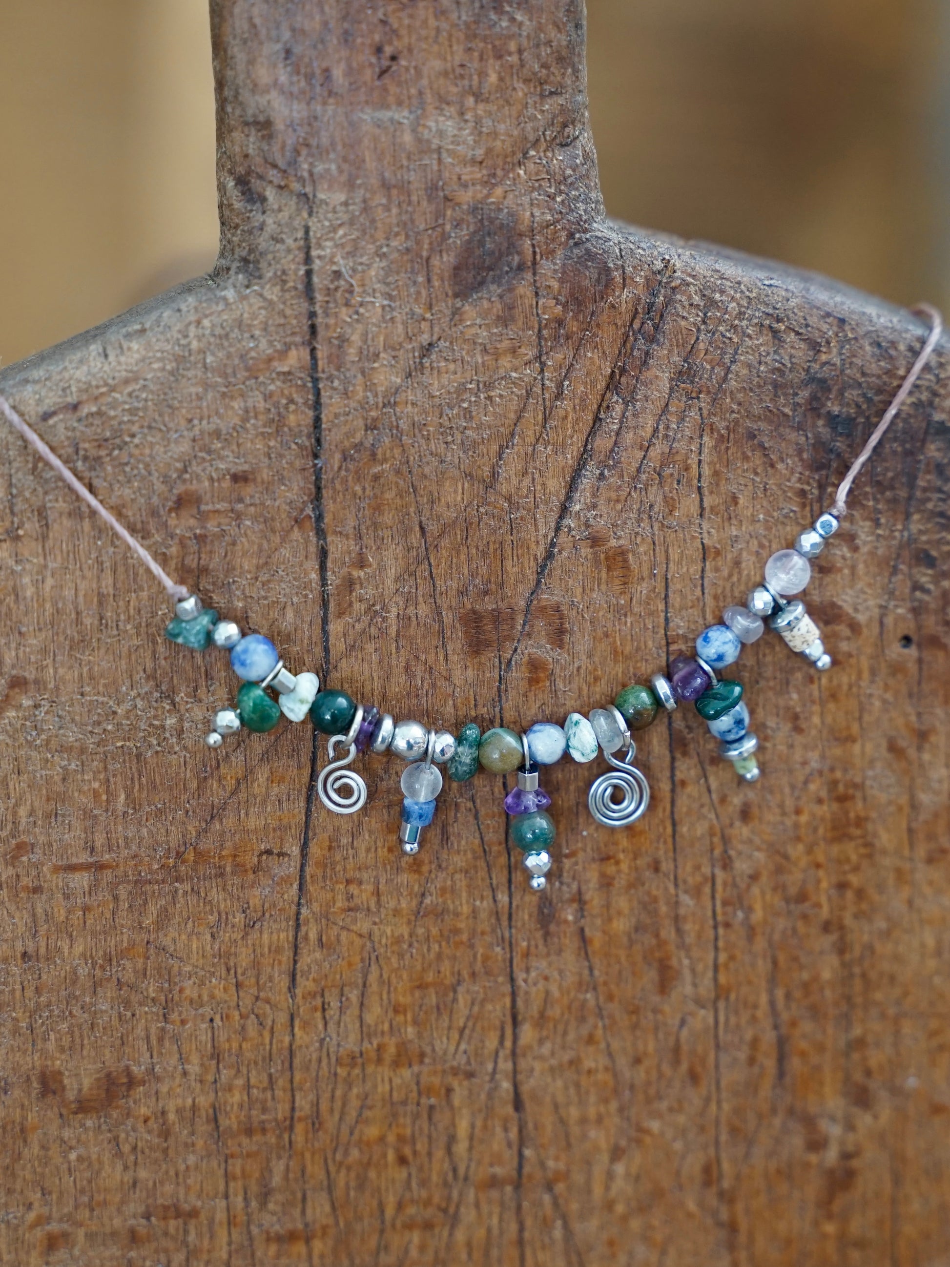 Eine besondere Kette aus braunem, Linhasita-Band, auf dem Sodalith-, Amethyst-, Quarz-, Achat- und Hämatit-Perlen aufgefädelt sind. Zusätzlich hängen handgefertigte, gehämmerte Edelstahl-Spiralen und einzelne Perlen herab, was der Kette eine verspielte und elegante Note verleiht.
