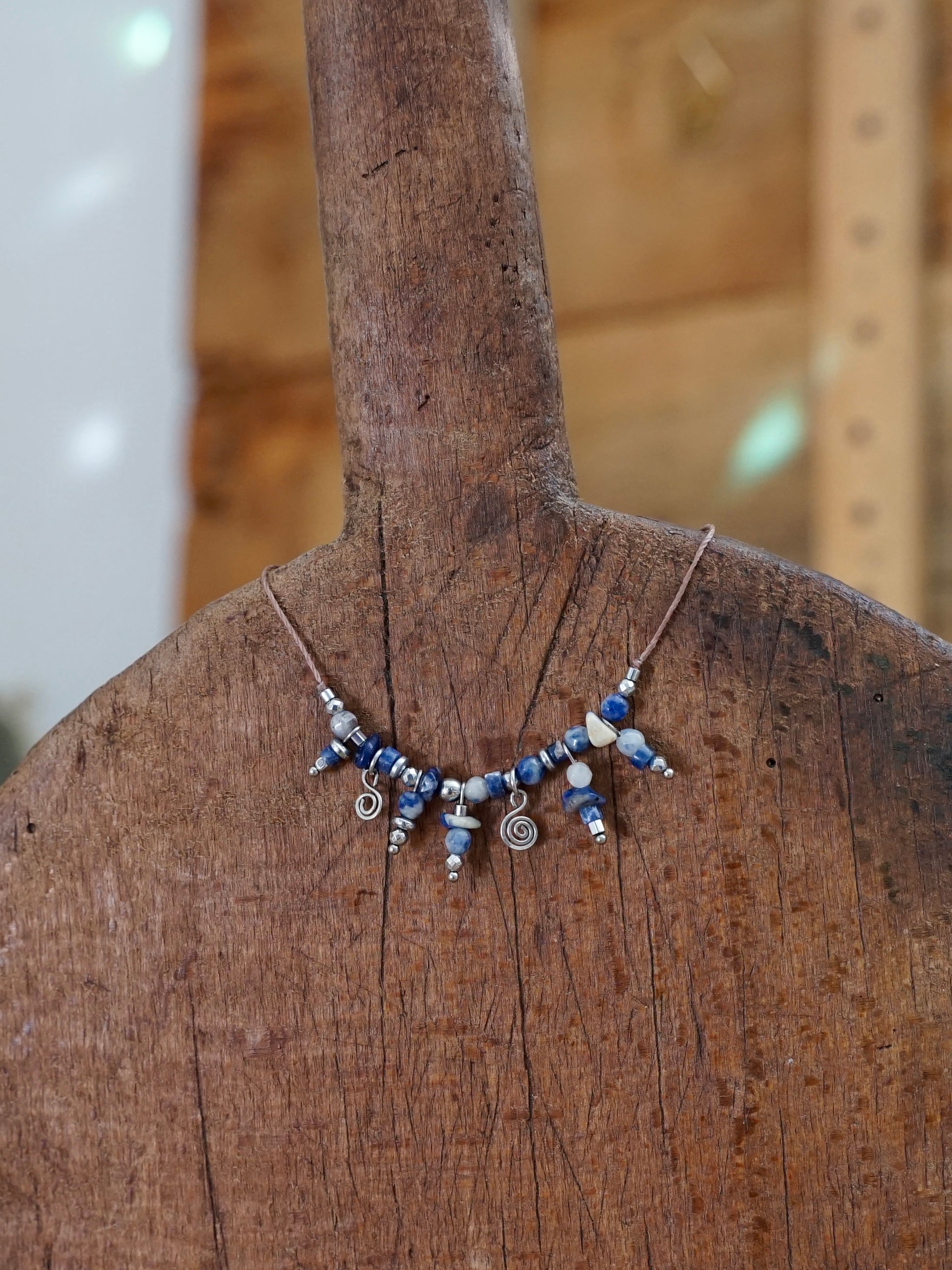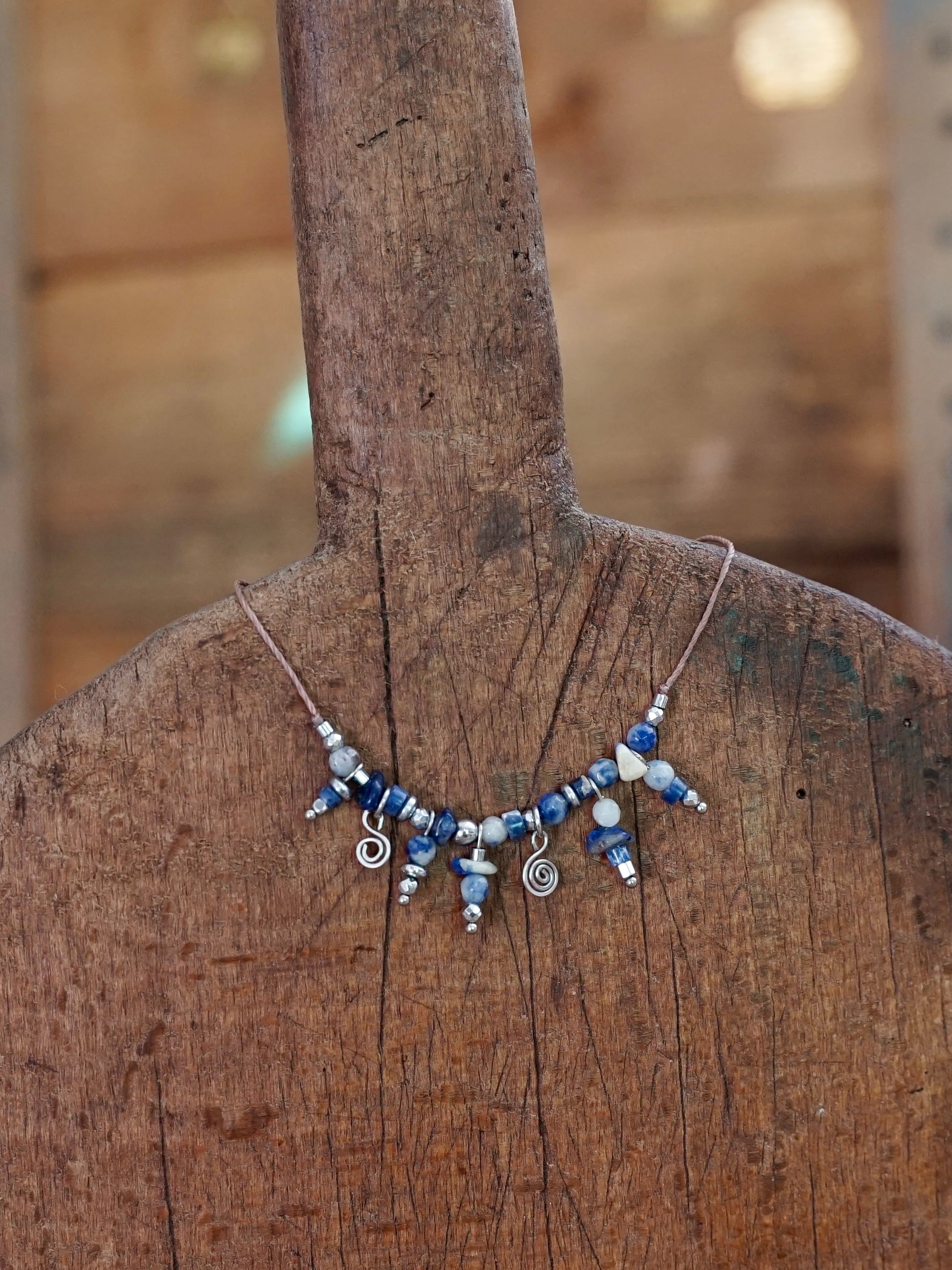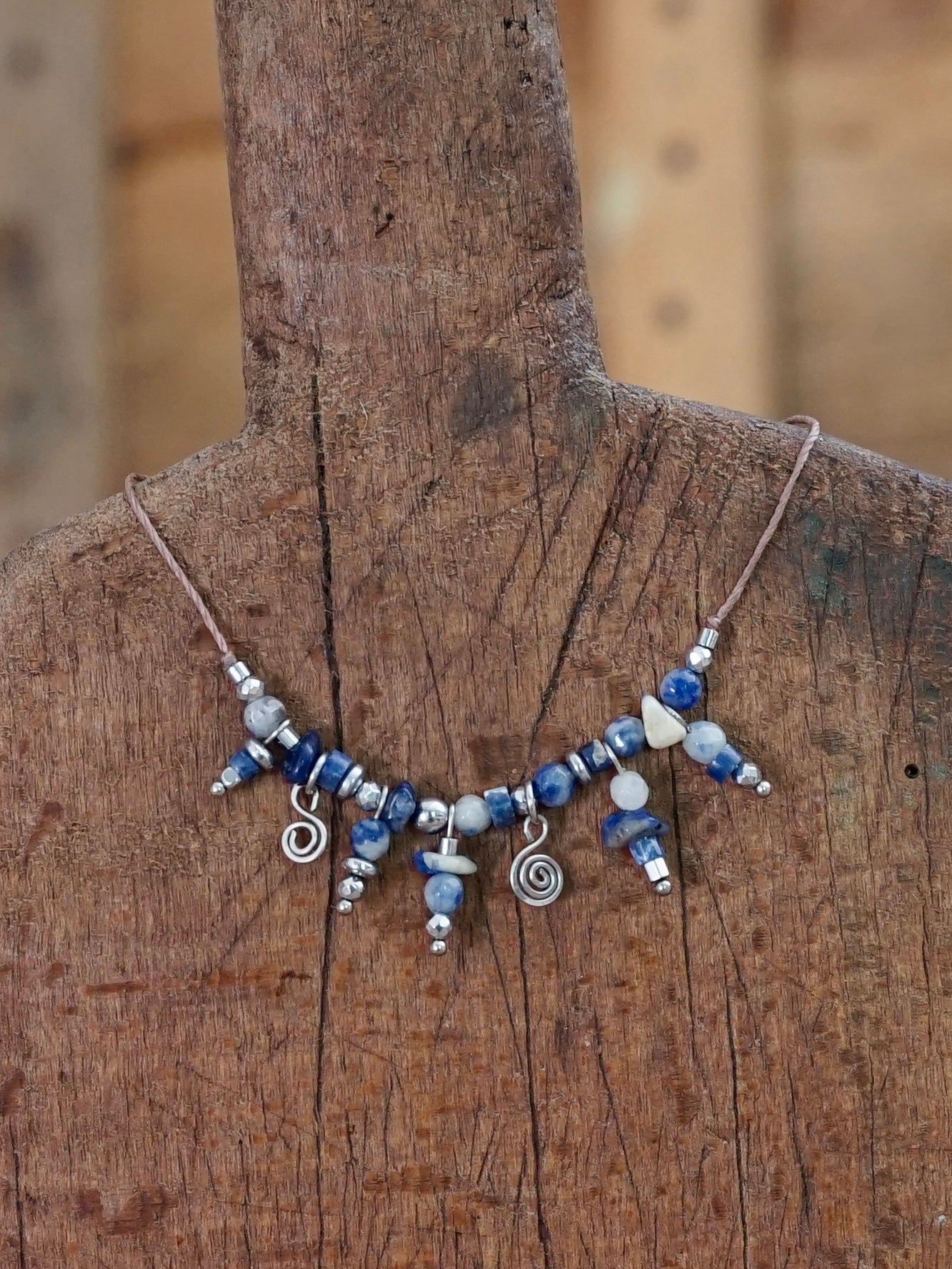 Eine besondere Kette aus braunem, robustem Linhasita-Band, auf dem Sodalith- und Hämatit-Perlen aufgefädelt sind. Zusätzlich hängen handgefertigte, gehämmerte Edelstahl-Spiralen und einzelne Perlen herab, was der Kette eine verspielte und elegante Note verleiht.