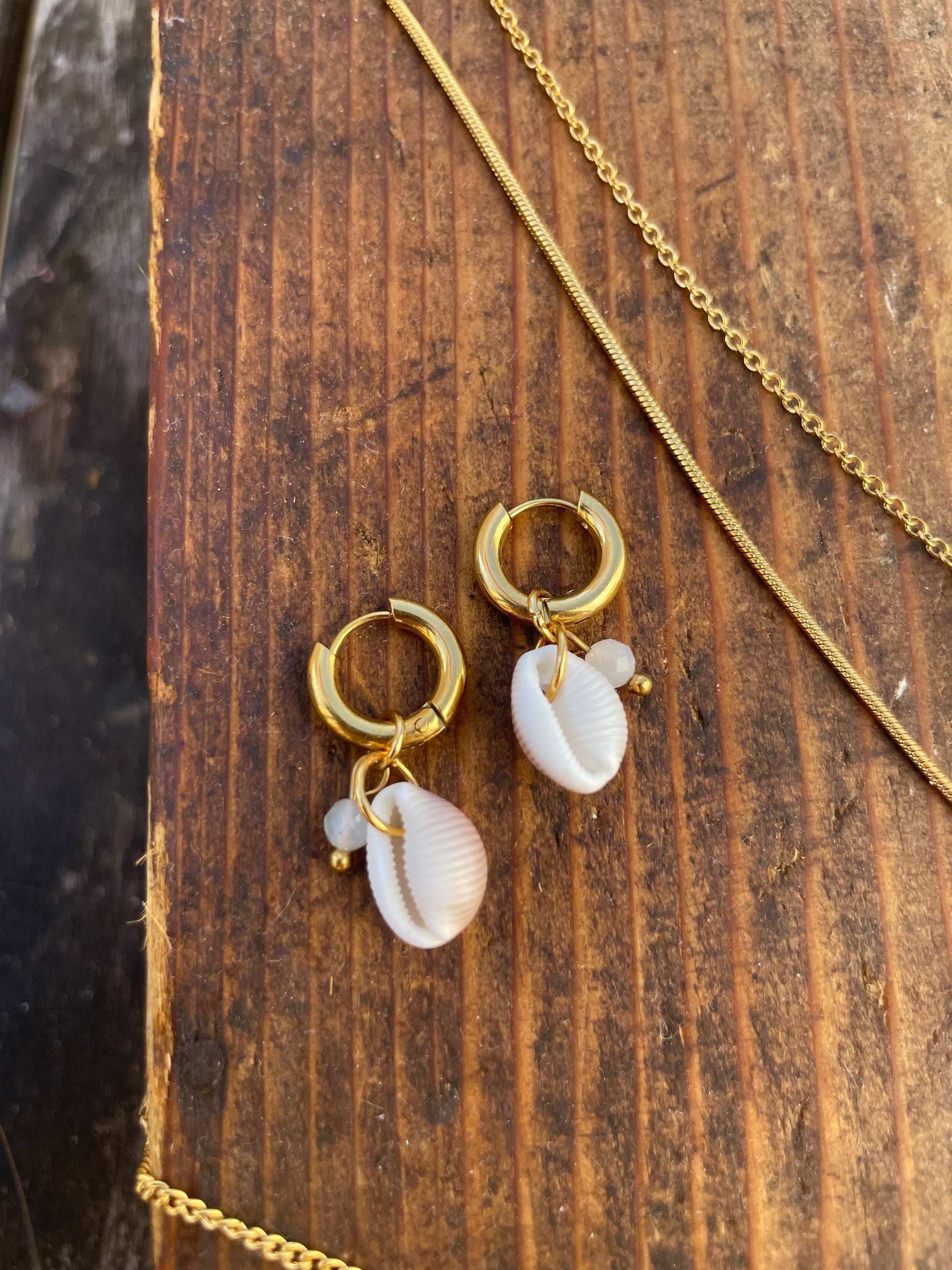 Feine Edelstahl-Kreolen mit einer kleinen, natürlich gerillten Kauri-Muschel und einer zarten Mondstein-Perle. Jede Muschel ist ein Naturprodukt und kann in Form und Farbe leicht variieren – das macht jedes Paar besonders. Perfekt für den Sommer!