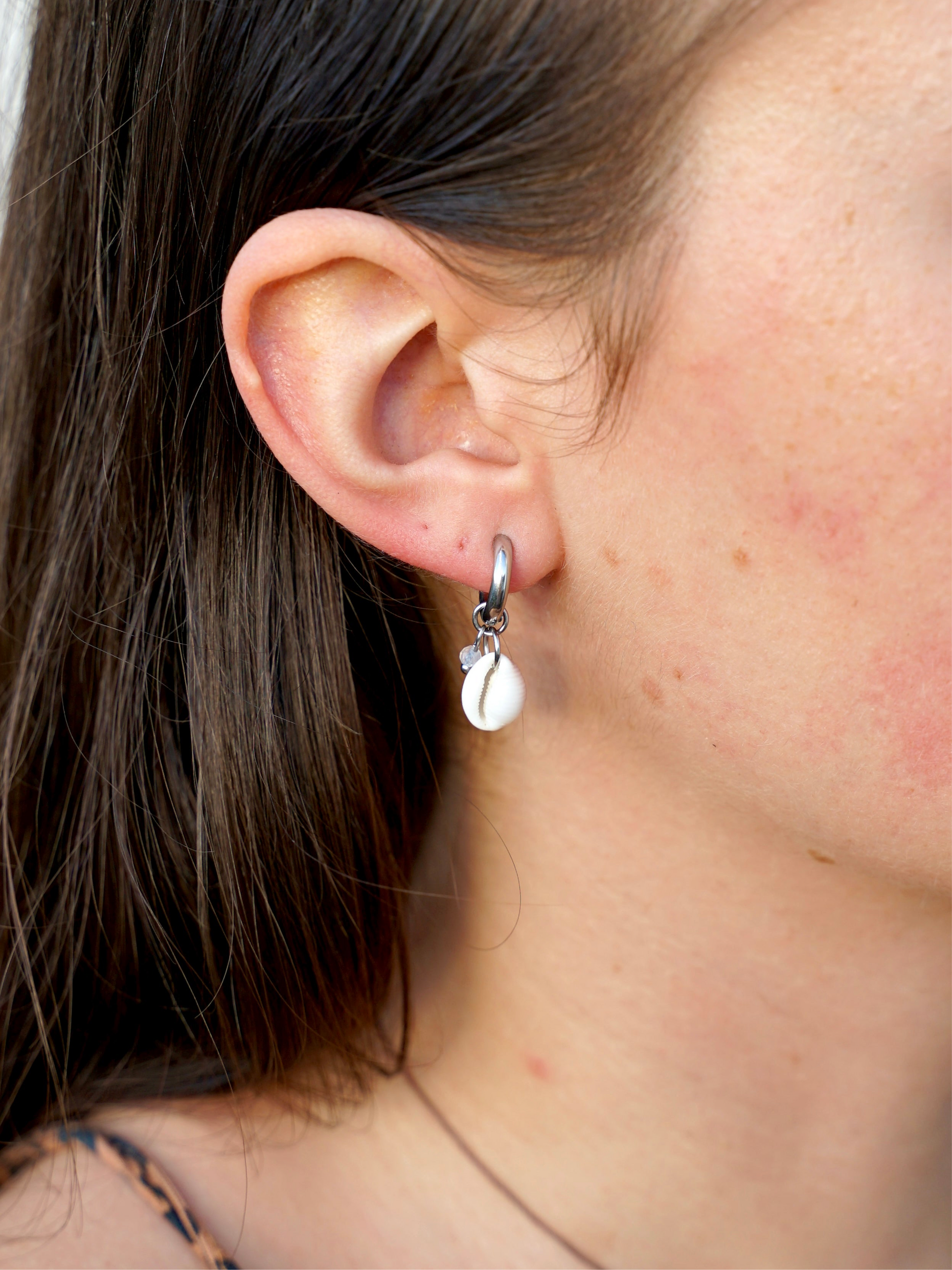 Feine Edelstahl-Kreolen mit einer kleinen, natürlich gerillten Kauri-Muschel und einer zarten Mondstein-Perle. Jede Muschel ist ein Naturprodukt und kann in Form und Farbe leicht variieren – das macht jedes Paar besonders. Perfekt für den Sommer!
