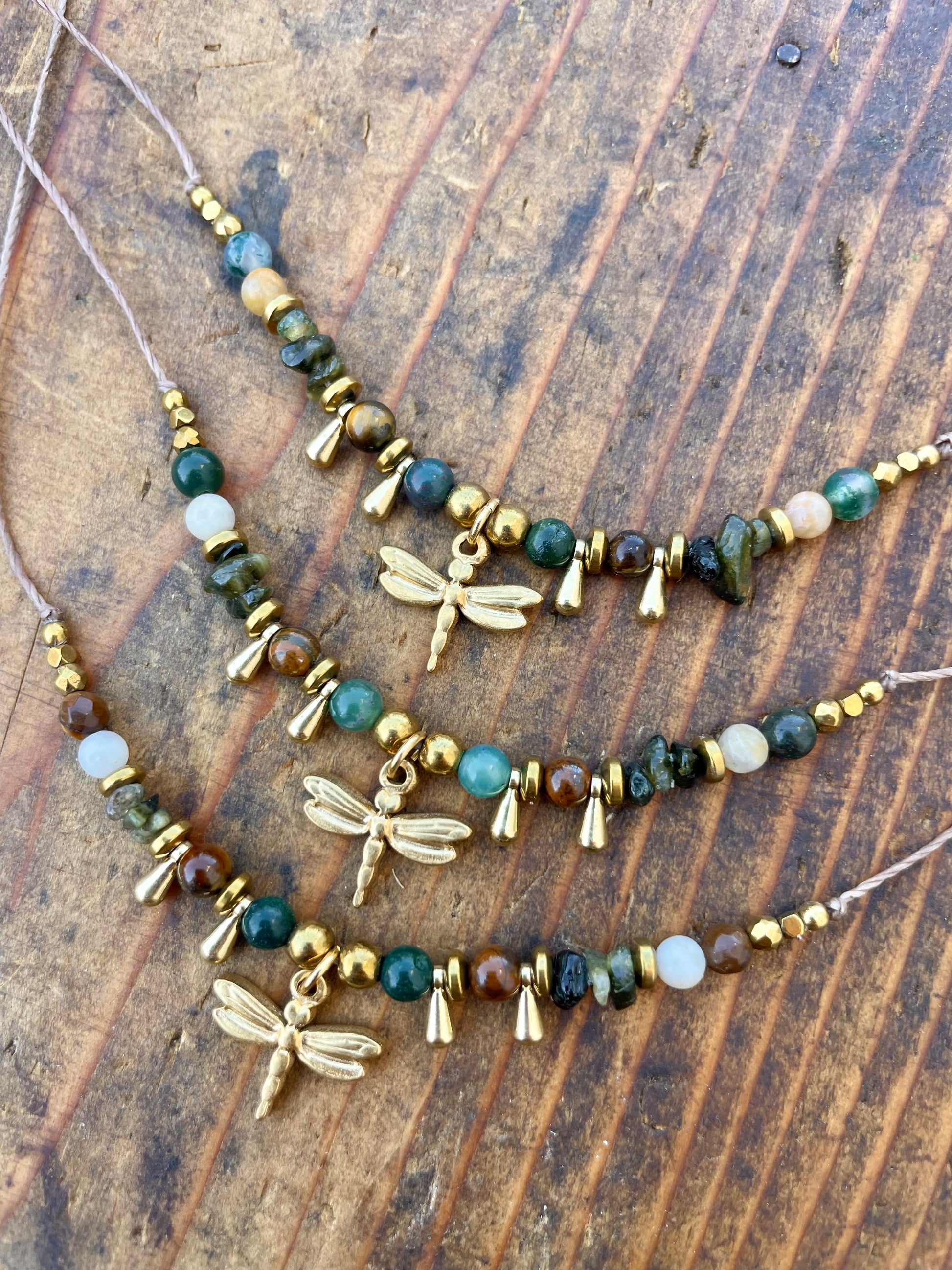 Eine stilvolle, größenverstellbare Kette aus braunem Linhasita-Garn, geschmückt mit warmen Tigerauge-Steinen, edlem Achat, grünem Turmalin, Quarz und einem Libellen-Anhänger aus vergoldetem Edelstahl. Dieses einzigartige Accessoire vereint natürliche Eleganz und zeitloses Design – ideal für Alltag und besondere Anlässe.