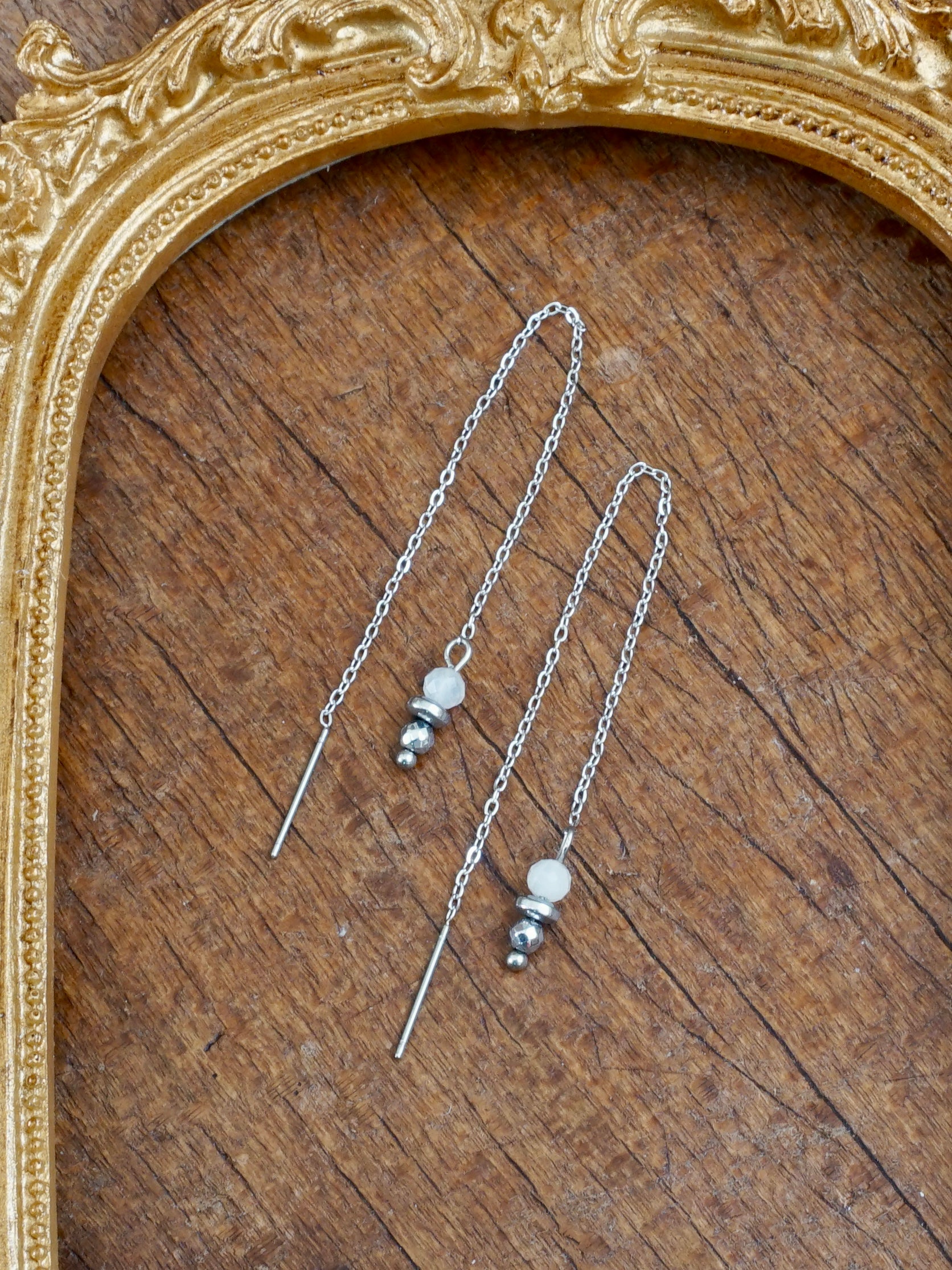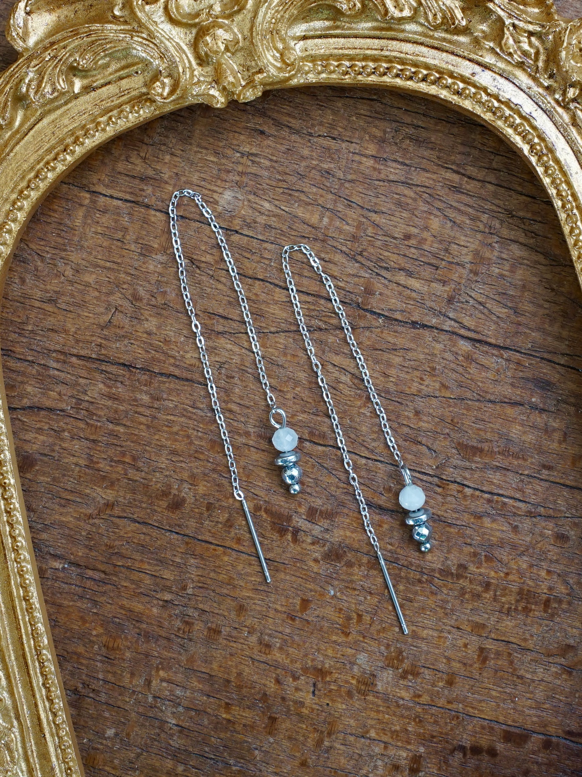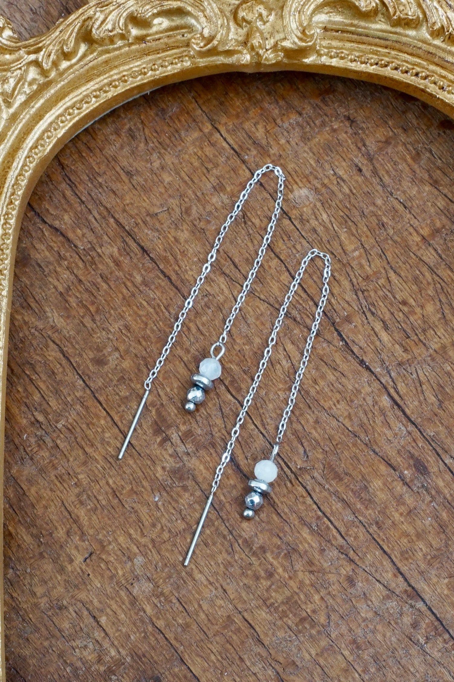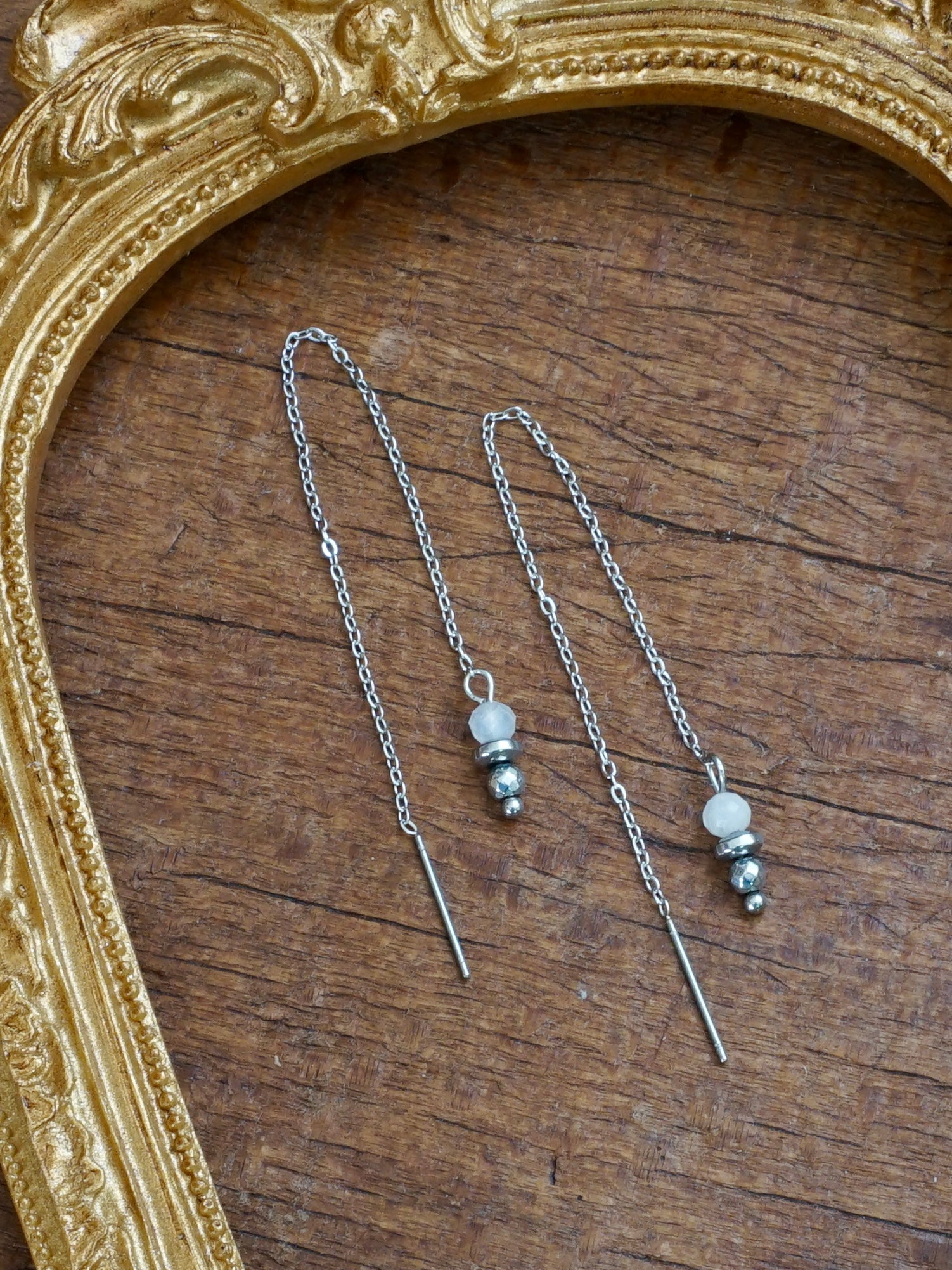 Ein wunderbar zarter Kettchen-Ohrring mit einem schimmernden Mondstein. Der Ohrring ist super leicht, sodass man ihn beim Tragen kaum spürt – ein filigranes Detail, das viel hergibt. Er hat einen kleinen Stift, mit dem du das Kettchen ganz sanft durch dein Ohrloch führen kannst. So kannst du die Tragelänge variieren und die Kette vorne oder hinten unterschiedlich lang hängen lassen. Falls du ein zweites Ohrloch hast, lässt sich das Kettchen auch dort wunderbar einfädeln und sorgt für einen kreativen Look.
