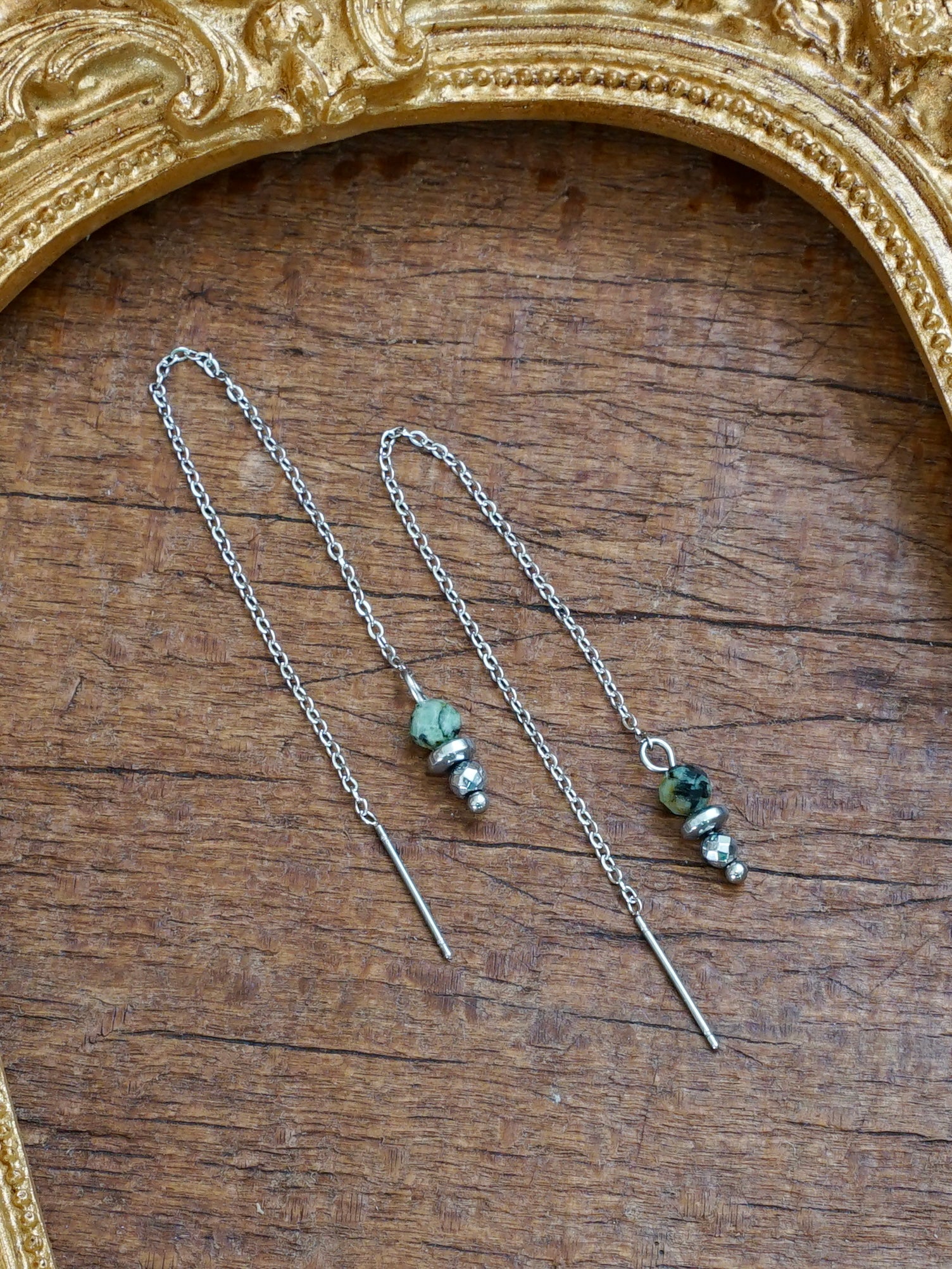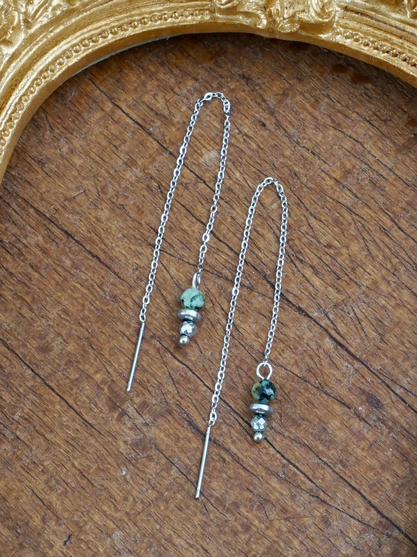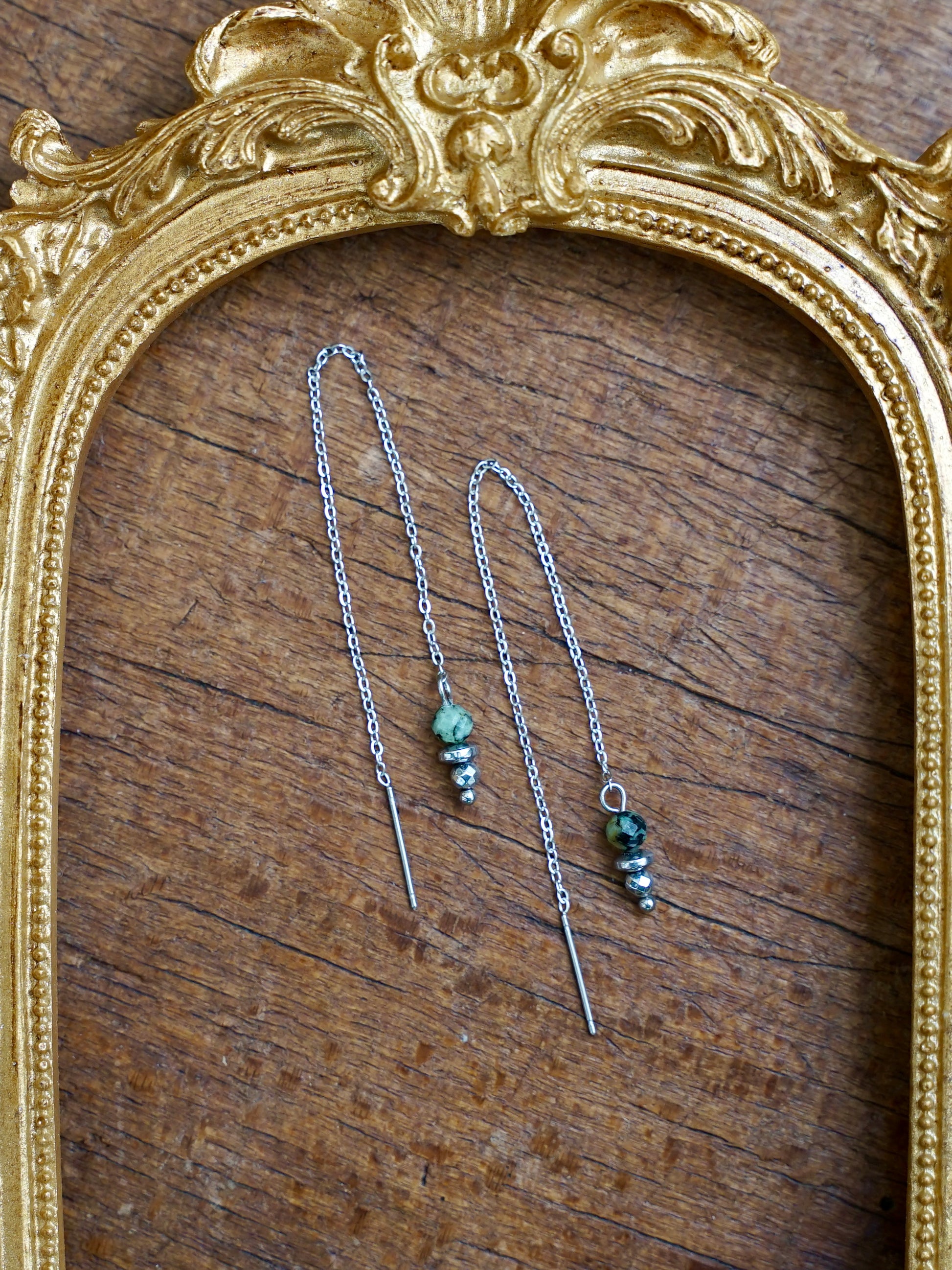 Ein wunderbar zarter Kettchen-Ohrring mit einem schimmernden Türkisstein. Der Ohrring ist super leicht, sodass man ihn beim Tragen kaum spürt – ein filigranes Detail, das viel hergibt. Er hat einen kleinen Stift, mit dem du das Kettchen ganz sanft durch dein Ohrloch führen kannst. So kannst du die Tragelänge variieren und die Kette vorne oder hinten unterschiedlich lang hängen lassen. Falls du ein zweites Ohrloch hast, lässt sich das Kettchen auch dort wunderbar einfädeln und sorgt für einen kreativen Look.