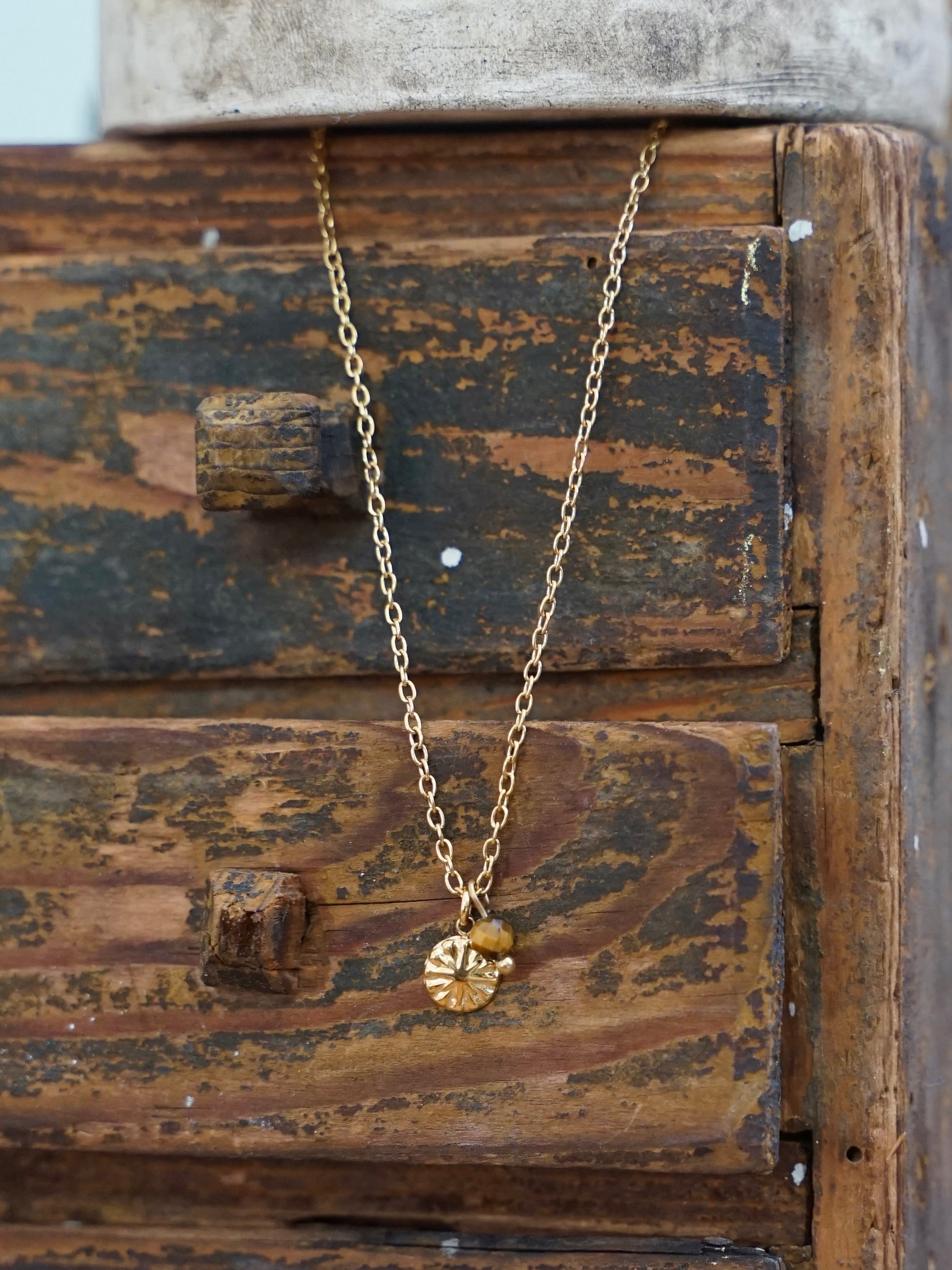 Eine elegante, filigrane Kette aus goldfarbenem Edelstahl mit einem schlichten Anhänger. Der Anhänger besteht aus einer Edelstahl-Scheibe mit einem eingravierten Stern und einer feinen Tigerauge Perle, die dem Design eine dezente Frische und Eleganz verleiht. Perfekt für den Alltag oder besondere Anlässe.