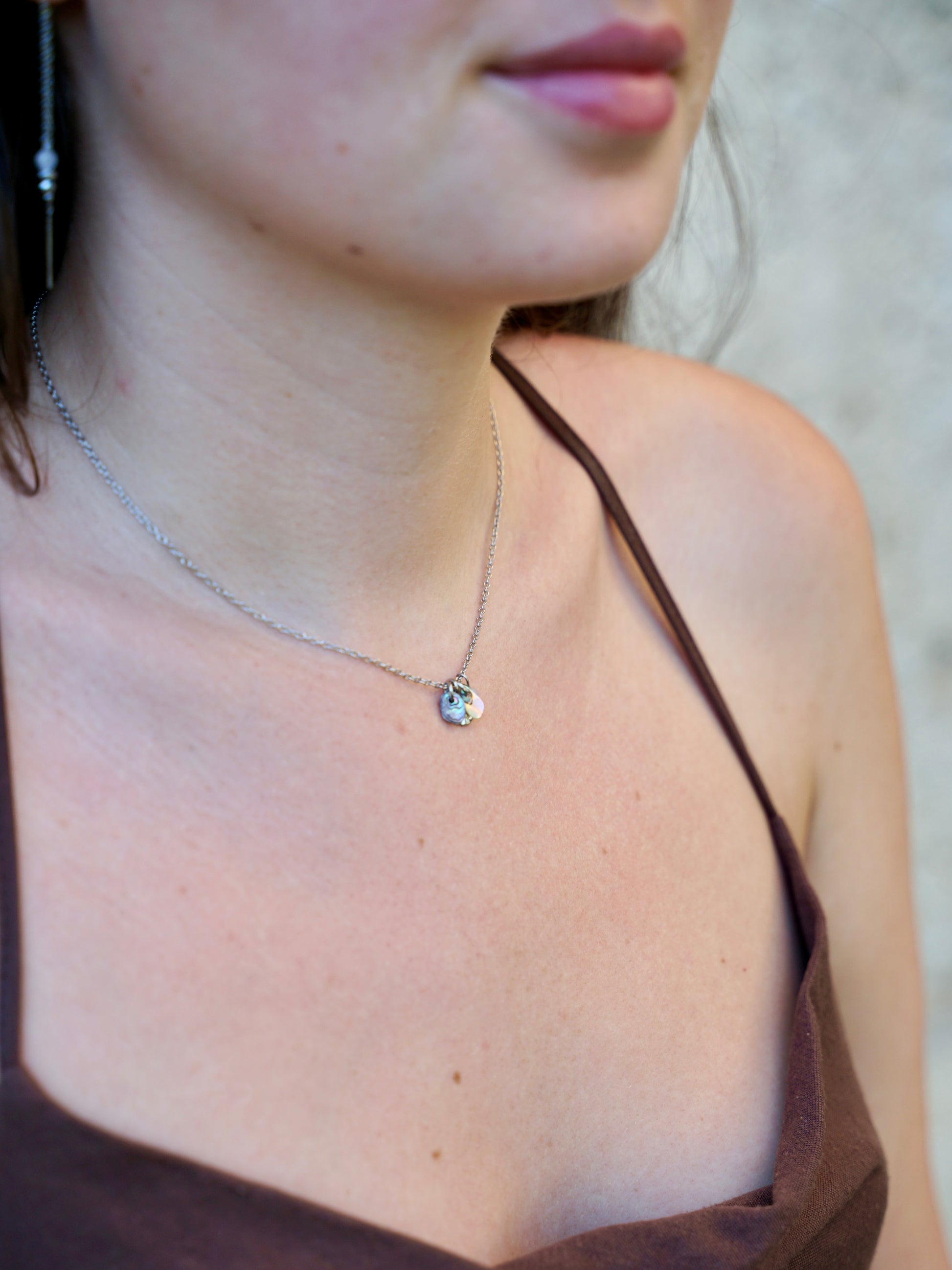 Eine feine Kette aus silbernem Edelstahl mit zwei schimmernden Abalone-Muschelstücken, einem filigranen Sonnenanhänger und einer kleinen Mondstein-Perle. Jedes Muschelstück ist ein Unikat – daher kann jede Kette leicht unterschiedlich aussehen. Ich wähle die Stücke sorgfältig aus, sodass sie dem Stil der Produktfotos sehr ähnlich sind. Perfekt für Alltag und besondere Momente.