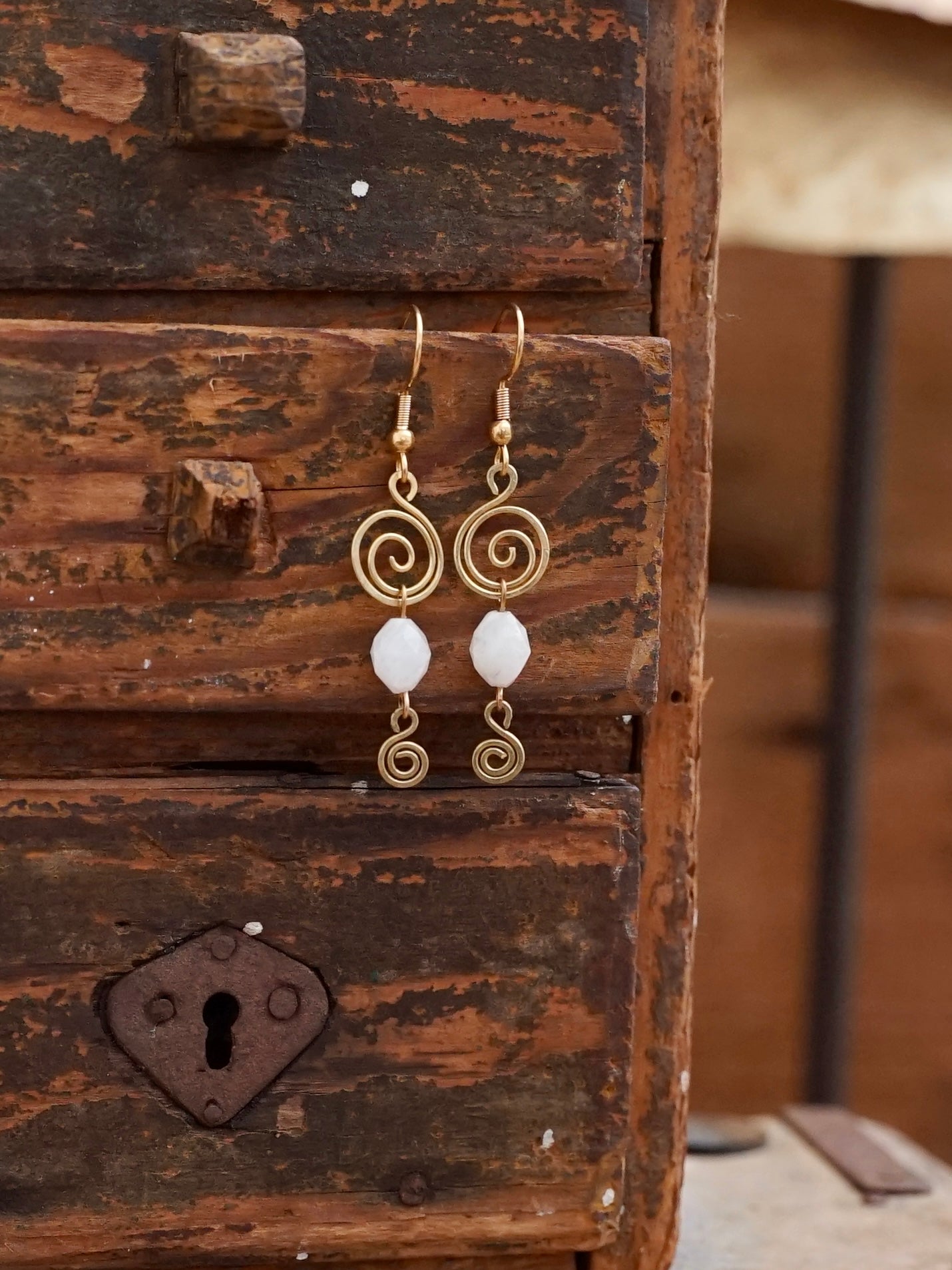 Ein elegantes Design mit einer Messing-Spirale und Mondstein. Diese Ohrringe sind stilvoll und vielseitig – perfekt für jeden Anlass.